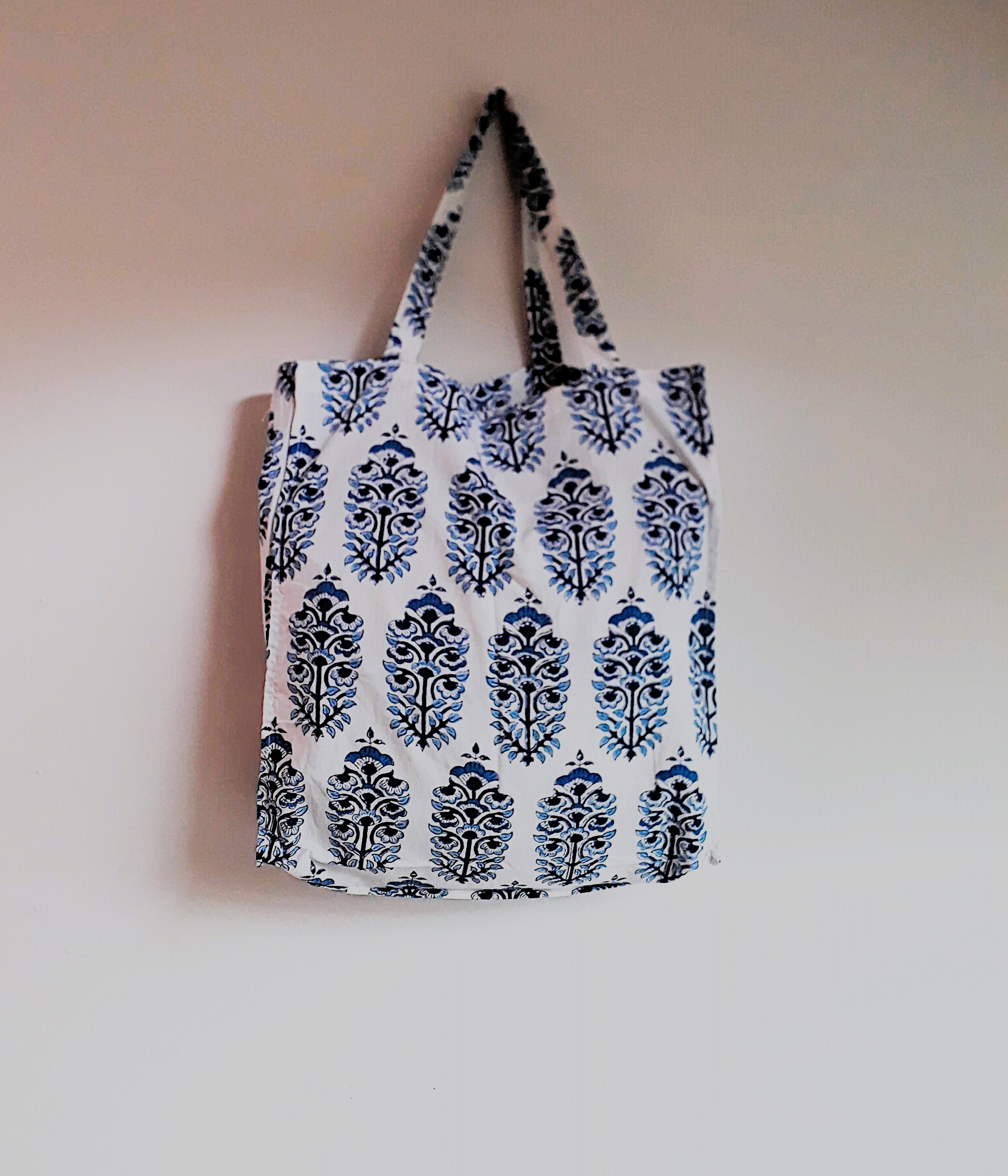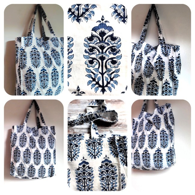 Pretty tote bags with gusset in Indian cotton fabric hand block printed with wooden carved stamps, using the traditional block print technique.