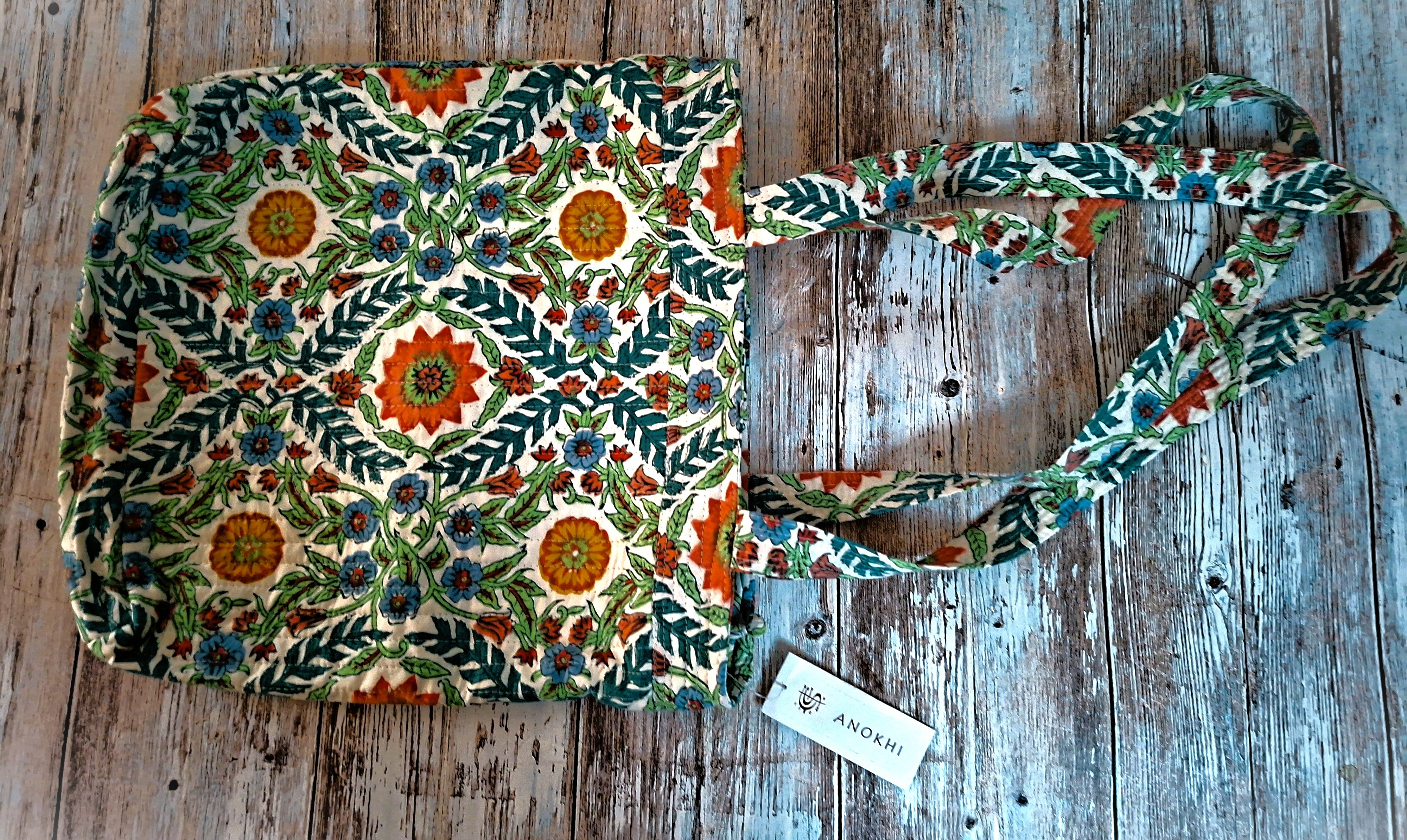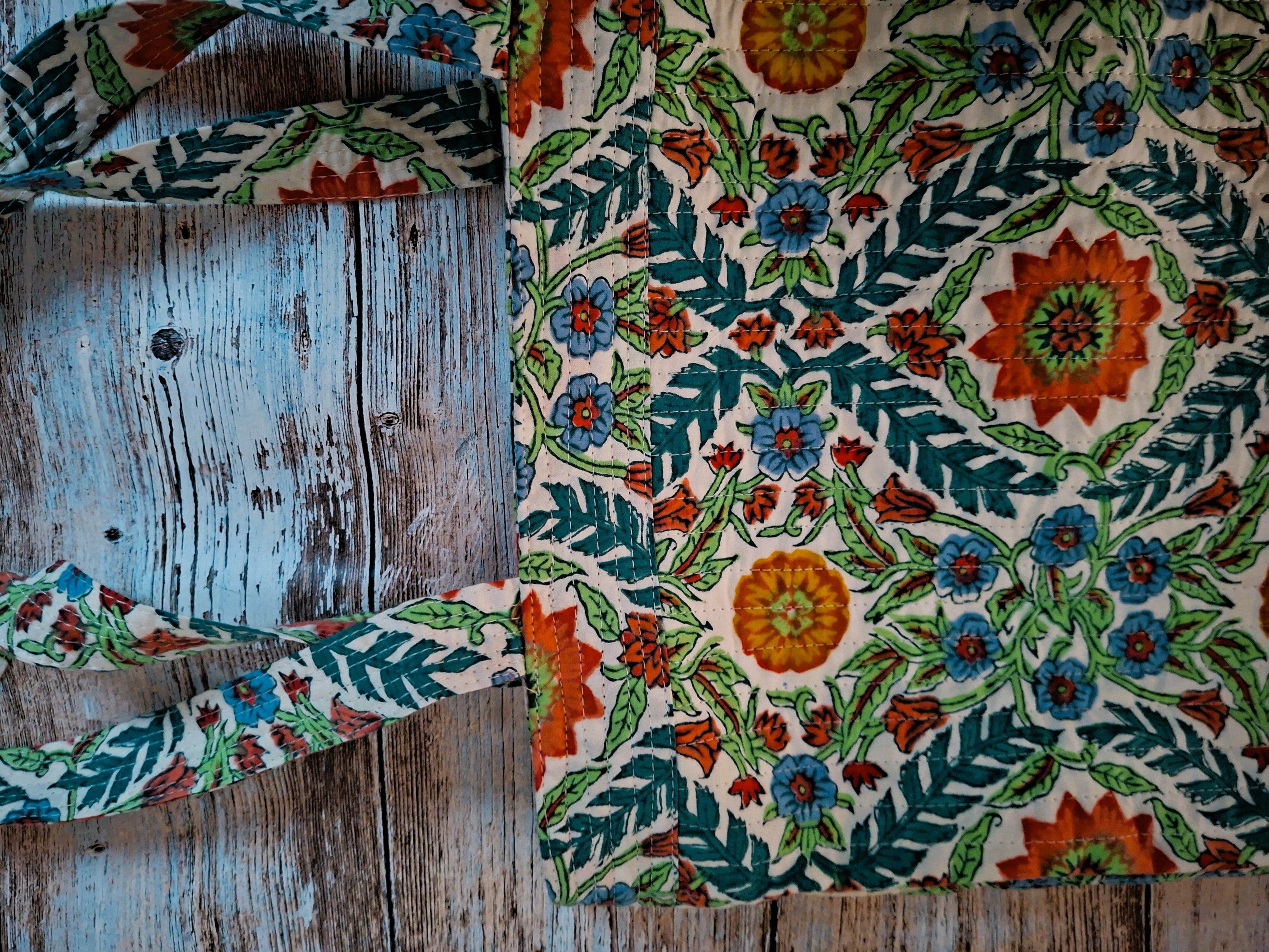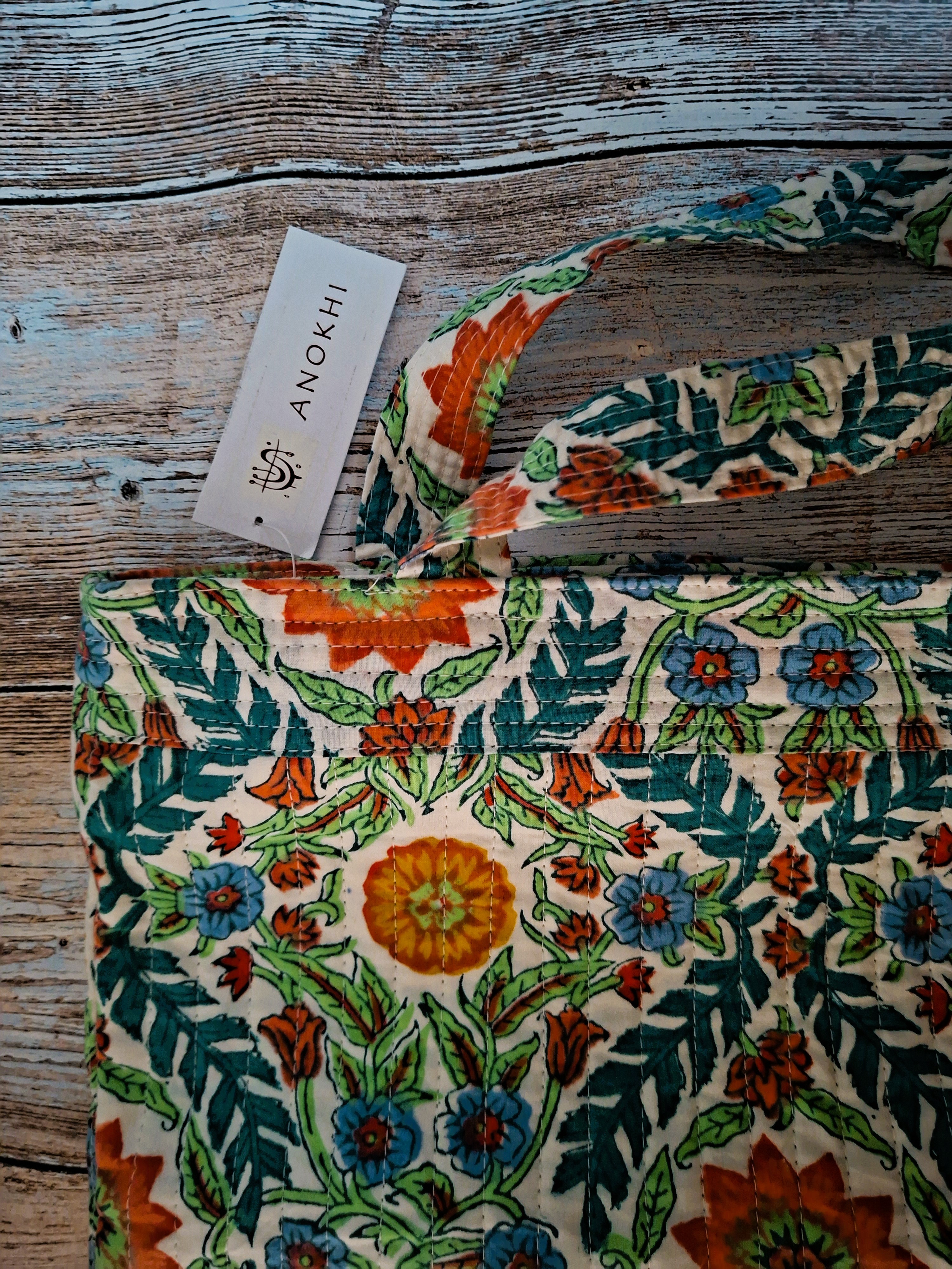 Pretty quilted tote bag rectangle in Indian cotton fabric hand block printed with wooden carved stamps, using the traditional block print technique.