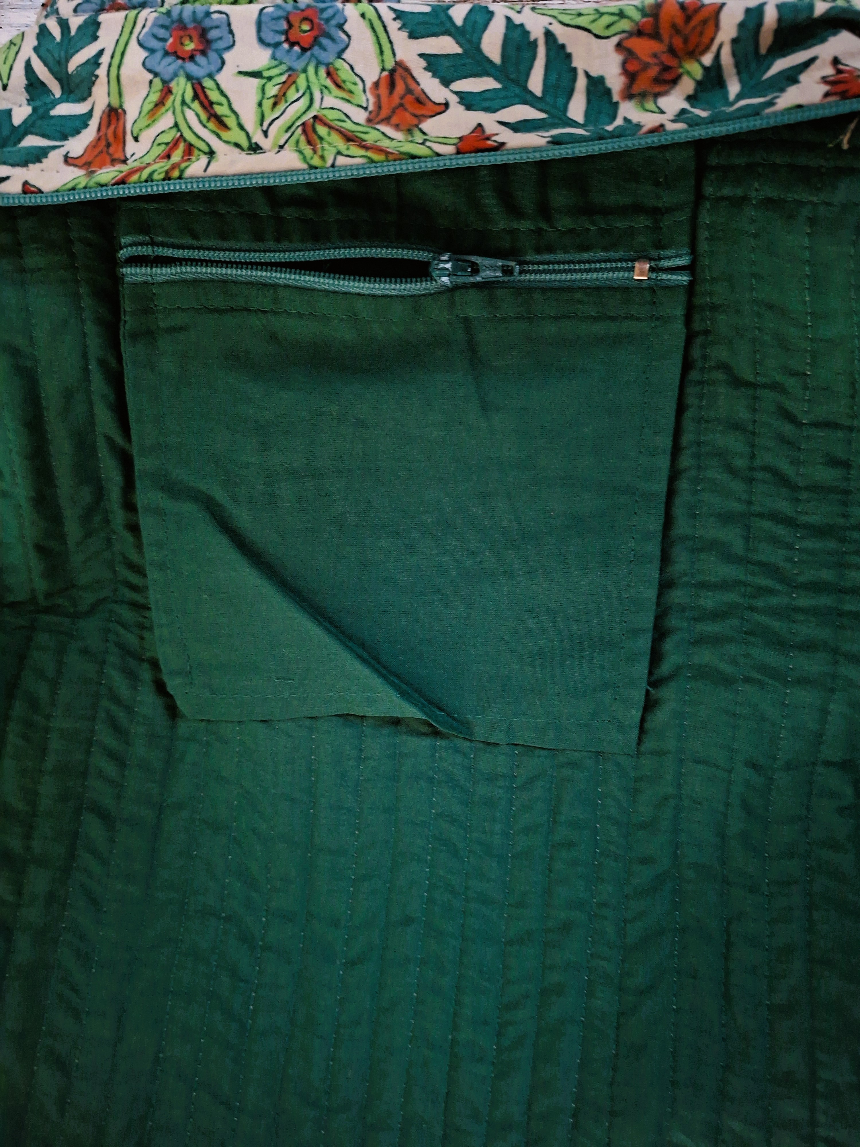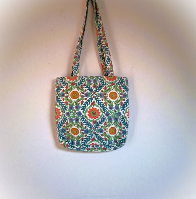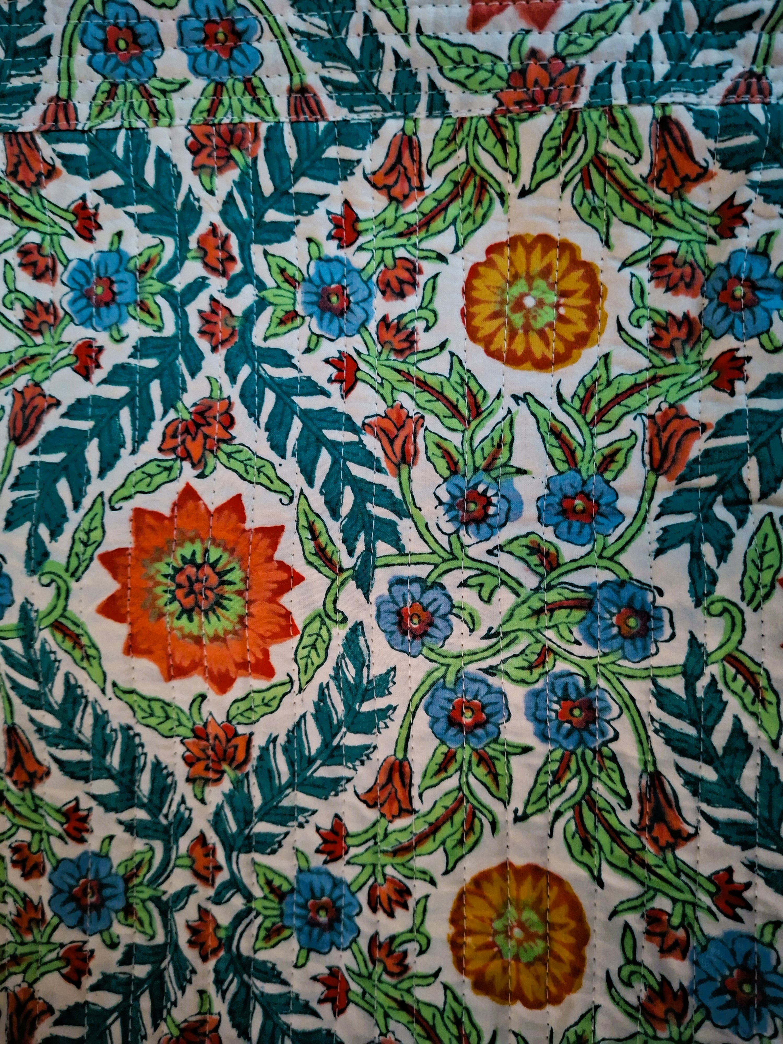 Pretty quilted tote bag rectangle in Indian cotton fabric hand block printed with wooden carved stamps, using the traditional block print technique.
