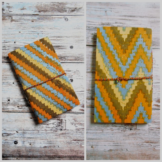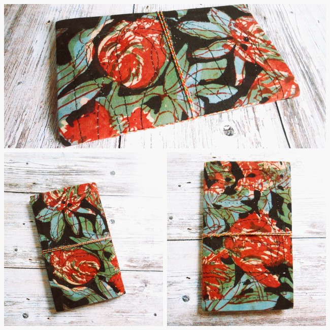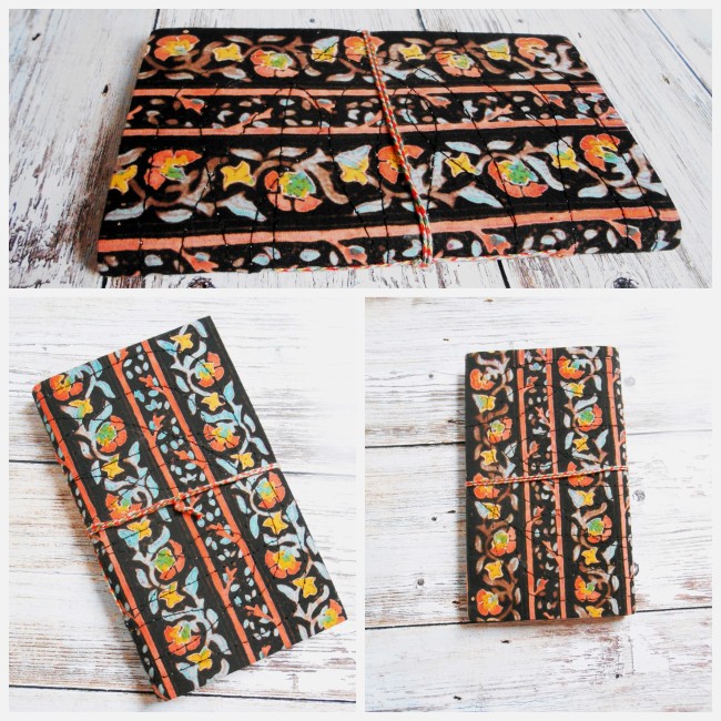 The notebook closes with a multicolored cotton tie sewn on the edge of the notebook and rolled around.