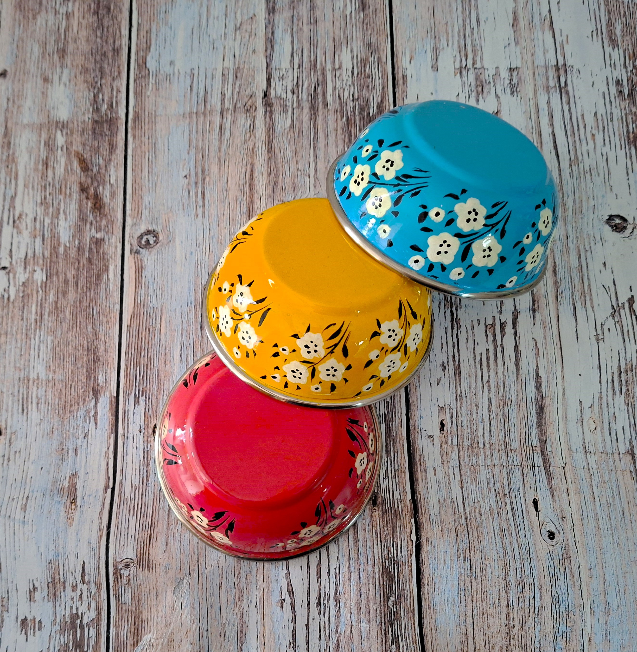 Adorable bol en acier inoxydable (intérieur) et vernis, émaillé à l'extérieur.