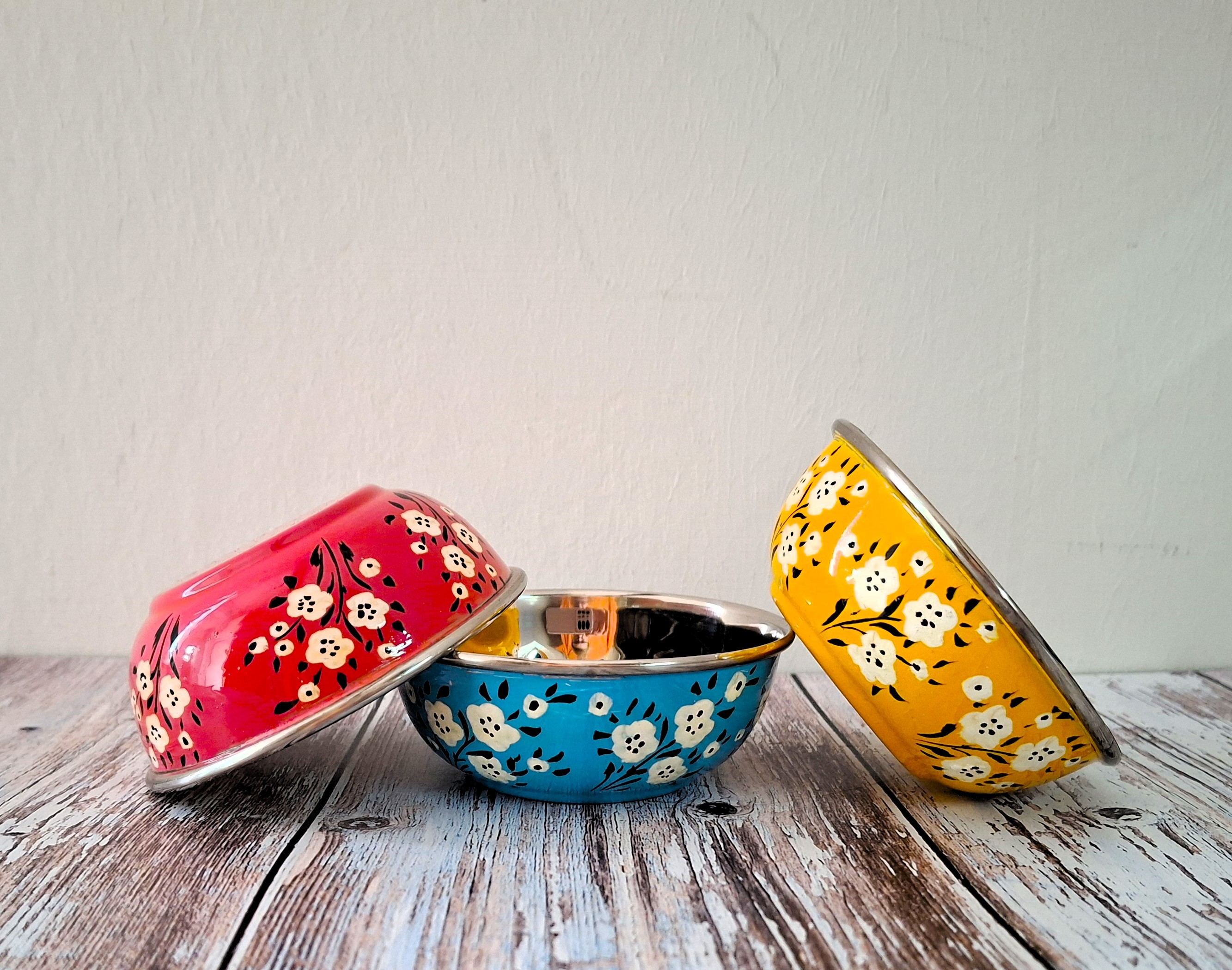 Cute small bowl in stainless steel (inside) and varnished / enameled outside.