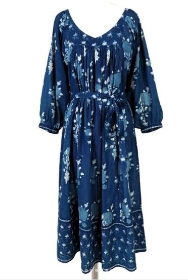 Robe longues indigo à manches amples en pur coton indien aux motifs imprimés à la main.