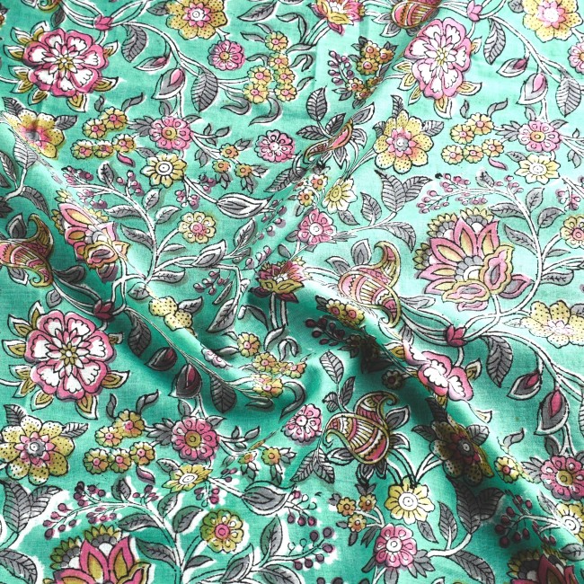 Tissu indien en coton léger aux motifs imprimés à la main au block print en Inde.