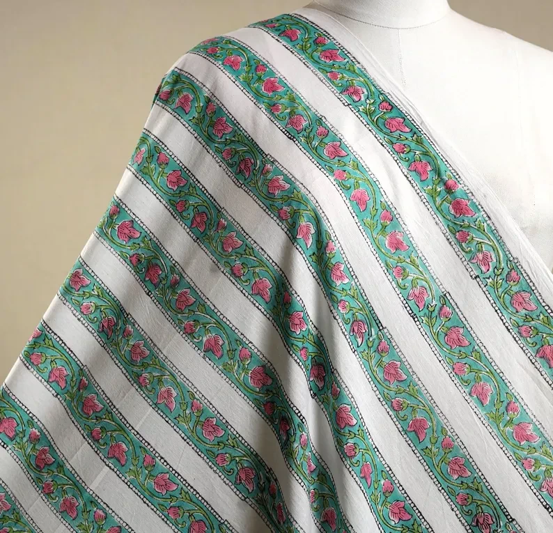 Indian light cotton fabric hand block printed with wooden stamps in India.